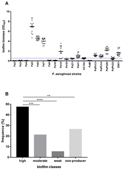 Most strains (14 out of 19, 73.7%) were able to form a biofilm, although with significant differences for biofilm biomass, measured as optical density at 492 wavelength (OD492) (OD492 range: 0.029–6.986; p < 0.0001, ordinary one-way ANOVA test) (Figure 1A). The highest biofilm biomass was produced by P. aeruginosa Pa5 (OD492, mean ± SD: 6.986 ± 1.124; p < 0.0001 vs. other strains), Pa6 (4.593 ± 0.340; p < 0.0001 vs. other strains but Pa7), and Pa7 (4.021 ± 0.581; p < 0.0001 vs. other strains) strains (Figure 1A). Considering the efficiency in forming biofilm measured according to the criteria proposed by Stepanović et al. [21], the prevalence of high biofilm-former (HBF) strains was significantly higher than in other groups (9 out of 19, 47.4%; Pa5, Pa6, Pa7, Pa14, Pa41, PaPh13, PaPh14, PaPh26, and DIN1 strains; p < 0.01, vs. other groups), followed by moderate biofilm-producer (MBF) strains (4 out of 19, 21%; Pa16, Pa21, AC12a, and PaPh32 strains), and weak biofilm-former (WBF) strains (1 out of 9, 11.1%; Pa9 strain) (p < 0.01, vs. other groups) (Figure 1B). Five strains (Pa2, Pa3, Pa4, Pa10, and PaM) could not form biofilm.