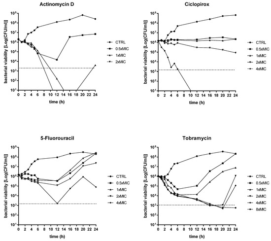 Kill kinetics of actinomycin, 5-fluorouracil, ciclopirox, and tobramycin against selected P. aeruginosa strains were evaluated by broth macrodilution. Briefly, the standardized inoculum (1–2 × 105 CFU/mL) was exposed to several concentrations of each drug in CAMHB and incubated at 37 °C. At prefixed times (1, 2, 3, 4, 5, 6, 12, 16, 20, and 24 h), a cell viable cell count was performed, and the results were expressed by plotting Log (CFU/mL) over time, considering 10 CFU/mL as the LOD. Control samples were prepared similarly but were not exposed to drugs. The carry-over antibiotic effect was not observed. Bactericidal activity was defined as a ≥ 3 Log (CFU/mL) reduction.