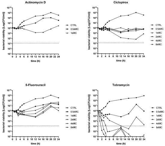 Time–kill kinetics against P. aeruginosa PaPh32. The kinetics of repurposed drugs was assessed, comparatively to tobramycin, over 24 h in a liquid medium. P. aeruginosa PaPh32 was chosen as representative of tobramycin-resistant strains. Each drug was tested at MIC value (actinomycin D: 133 mg/L; ciclopirox: 256 mg/L; 5-fluorouracil: 512 mg/L; tobramycin: 64 mg/L), its fractions and multiples, compatibly with the drugs’ solubility. The dotted line indicates bactericidal activity, defined as a ≥ 3 Log (CFU/mL) reduction of the initial inoculum size. The limit of detection was 10 CFU/mL.