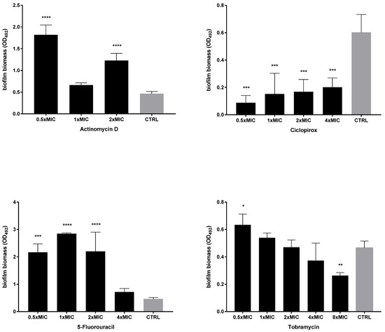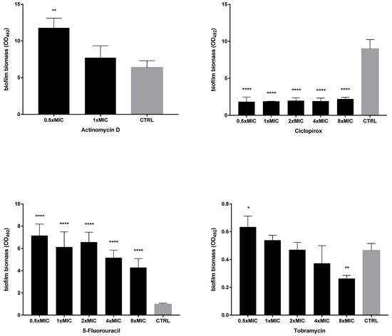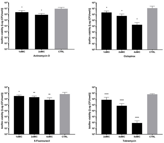 Killing activity against preformed biofilms by P. aeruginosa PaPh32. The efficacy of actinomycin D, ciclopirox, and 5-fluorouracil on the viability of 24 h mature biofilms by P. aeruginosa PaPh32 was assessed, comparatively to tobramycin, using cell viable count assay. Each drug was tested at multiples of MIC value. Results are expressed as mean + SD of the residual biofilm viability [Log (CFU/well)] after 24 h of exposure. Control samples (CTRL) were not exposed to the drug. Statistical significance at ordinary one-way ANOVA + Holm–Sidak’s multiple comparisons post-test: * p < 0.05, ** p < 0.01, **** p < 0.0001 vs. CTRL.