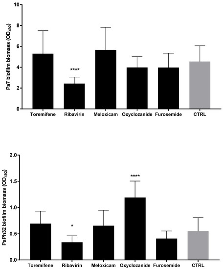 Since the antibiofilm effect could be specific and not related to antibacterial activity, the dispersal activity was also evaluated for drugs, which were not active against planktonic P. aeruginosa cells (Figure 6). Ribavirin was the only drug able to significantly decrease biofilm biomass, effective against both strains tested, although to different extents (biomass removal: 53.5% and 35.1%, respectively, for Pa7 and PaPh32; p < 0.001). Conversely, exposure to oxyclozanide significantly improved biofilm formation by about 100%, although only in the case of the PaPh32 strain.