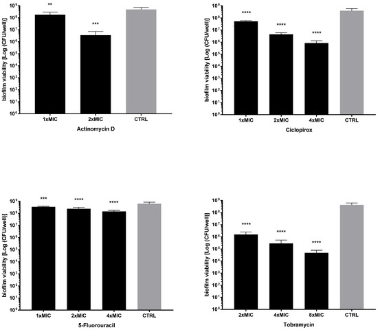 Killing activity against preformed biofilms by P. aeruginosa Pa7. The efficacy of actinomycin D, ciclopirox, and 5-fluorouracil on the viability of 24 h mature biofilms by P. aeruginosa Pa7 was assessed, comparatively to tobramycin, using cell viable count assay. Each drug was tested at multiples of MIC value. Results are expressed as mean + SD of the residual biofilm viability [Log (CFU/well)] after 24 h of exposure. Control samples (CTRL) were not exposed to the drug. Statistical significance at ordinary one-way ANOVA + Holm–Sidak’s multiple comparisons post-test: ** p < 0.01, *** p < 0.001, **** p < 0.0001 vs. CTRL.