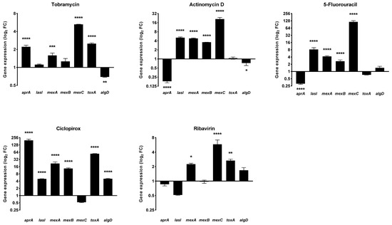 The effect of 20 h of exposure to actinomycin D, 5-fluorouracil, ciclopirox, and ribavirin at 1/4xMIC on the expression of selected virulence genes of P. aeruginosa PaPh32 was evaluated, comparatively to tobramycin, by real-time RT-qPCR, and the results are shown in Figure 9.