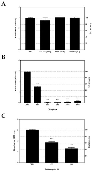 The cytotoxic potential of actinomycin D, 5-fluorouracil, ciclopirox, and ribavirin was investigated, in comparison with tobramycin, using a cell-based MTS assay. Each drug was tested at the maximum concentration active against planktonic and/or biofilm P. aeruginosa cells (Figure 10).