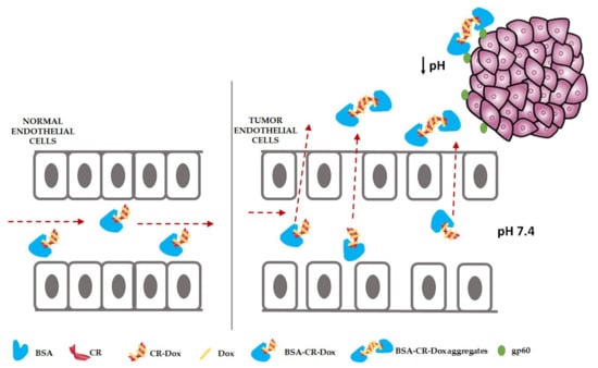 Probably, when lowering the pH, CR molecules bind more tightly with each other (lowering the charge). Dialysis results showed the removal of Dox from the triple complex. This observation is comparable to the result obtained during the modeling of the SWNT–CR–Dox system []. From the point of view of using albumin as a carrier, we can assume that a small protein, which is albumin, binds the CR–Dox complex, transports it in the body, while protecting against non–specific Dox release and CR binding, e.g., to the vascular bed. It is worth emphasizing that only the free fraction of the drug is pharmacologically active, while the bound form of the drug is usually inactive. Unbound (free) drugs can easily diffuse nonspecifically into cells. On the other hand, the drug–protein complex (in the present case, drug–CR–albumin) is large, which limits its ability to leave the vascular space and enter the cells unspecifically. Moreover, any drug–protein complex is usually too large to be filtered by the glomeruli. The only unbound drug can be filtered and excreted by the kidneys. Thus, plasma protein binding also affects the drug clearance through the kidneys, which will increase the presence of the drug in the body and thus the duration of its action []. Vessels surrounding the tumor are characterized by increased permeability and, in addition, BSA receptors are present on the tumor tissue. This contributes to the increased uptake of nanoparticles by the neoplastic tissue. Both the passive and active transport of albumin with related drugs can take place. We assume that after penetrating the tumor tissue, under the influence of a lowered pH, BSA–CR could aggregate, and Dox is released. It is possible that due to aggregation and size–up, the system will remain in the tumor environment for longer, gradually releasing the drug (Figure 1).