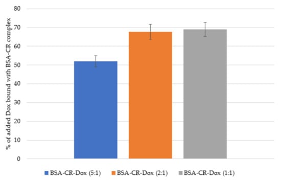 Percentage of added Dox bound with BSA–CR complex (mean ± SD, n = 3): for 5:1 molar ratio 52% ± 3%; for 2:1 molar ratio 67.8% ± 4.1%; for 1:1 molar ratio 69% ± 3.8%.