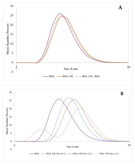 Increasing the amount of Dox bound to CR automatically increases the size of the CR–Dox complex. The DLS method estimated whether two BSA molecules were bridged by the bound CR–Dox complex, or whether only as the amount of Dox bound increased, the BSA–CR–Dox diameter increased due to the CR–Dox complex protruding beyond the BSA gap. The sizes of hydrodynamic diameters of the formed complexes were estimated (Figure 5).