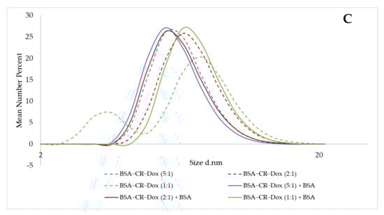 The addition of free CR to albumin slightly increased the hydrodynamic diameter of the BSA molecule (by about 0.7 nm). The addition of excess BSA did not lead to the bridging of two BSA molecules with CR because we did not observe an increase in the hydrodynamic diameter of the molecules (Figure 5A). As the amount of doxorubicin added to CR and the binding of the CR–Dox complex thus formed with BSA increased, we observed a gradual increase in the hydrodynamic diameter of the system (Figure 5B). Adding an additional portion of BSA to the complexes thus formed did not increase the hydrodynamic diameter of the systems, and even their reduction was observed (Figure 5C). It may indicate the detachment of CR–Dox complexes protruding beyond the BSA molecule by excessively added albumin.