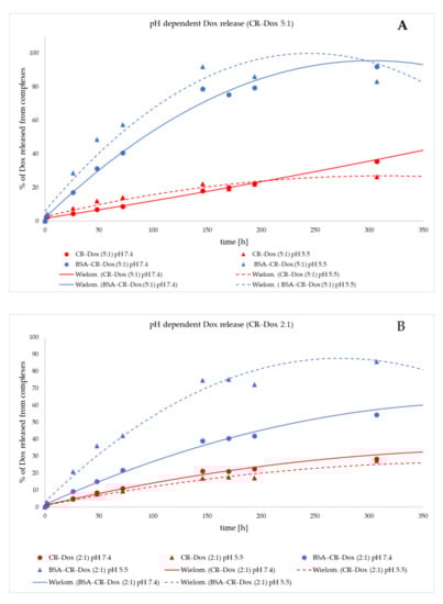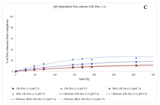 Additionally, at the same time, the release of Dox complexed with CR at three different molar ratios (CR–Dox 5:1, 2:1, and 1:1) and additionally bound to BSA (BSA–CR–Dox) was observed. Albumin increased the release of Dox from the complex gradually over time, reaching the value of about 70–80% during 150 h both at pH 7.4 and 5.5 if the CR–Dox molar ratio was 5:1 (Figure 6A). The best results were recorded for the 2:1 CR–Dox molar ratio in the BSA–CR–Dox complex, as the value of 70% Dox release during 150 h was achieved only at pH 5.5, while at the same time, at pH 7.4, the drug release remained at 30%. Such a system has a chance to remain stable at the physiological pH and only in the environment of the lowered pH of the neoplastic tissue gradually releases the drug (Figure 6B).