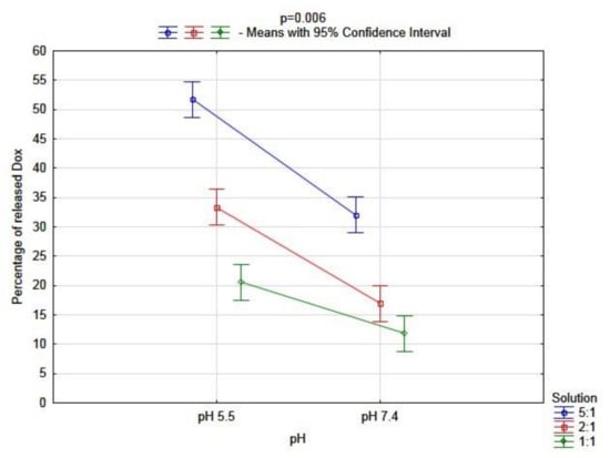 To explain the above–described phenomenon, a multivariate analysis was performed. In terms of pH (p = 0.079) and molar ratio (p = 0.191), there were no significant differences between solutions of the CR–Dox complex in the percentage of the released drug. Additionally, there was no significant interaction between those factors (p = 0.523) (Figure 8). It may be assumed that due to the stable character of the CR–Dox complex, the molar ratio and pH of the solution had a weaker influence on the amount of released doxorubicin.