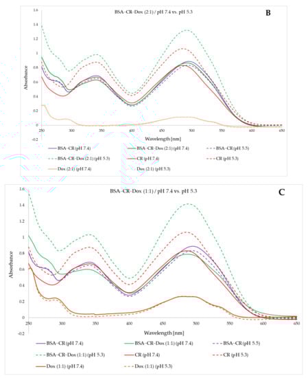 A composite graph shows the BSA–CR–Dox spectra at three molar ratios of CR–Dox (5:1, 2:1, and 1:1) at two different pH values (7.4 and 5.3). The formation of BSA–CR–Dox complexes was observed at pH 7.4, as all three complexes had a spectrum lower than or at the same level as BSA–CR (Figure 11). Lowering the pH in all cases increased absorbance, which was interpreted as the release of Dox and CR from albumin. Figure 11A–C show successive changes in the spectra depending on the pH separately for the analyzed three BSA–related CR–Dox ratios.