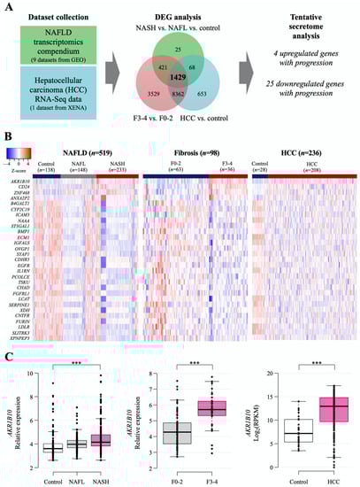 Computational identification of the tentative secretome reflecting NAFLD progression that was available from the analyses of public gene datasets. (A) Workflow of secretome identification by analyzing public datasets of NAFLD- and HCC-related genes. Detailed information on the datasets is described in Section 4 and presented in Supplementary Table S1. (B) Heatmap of putative secretory biomarker genes. Stepwise upregulated (upper 4 listed genes) and downregulated common genes (lower 25 listed genes) according to disease progression. (C) Hepatic AKR1B10 expression according to the progression of NAFLD was divided into 3 categories of disease progression. ***, p < 0.001.