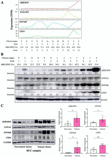 Hepatic expression of the AKR1B10 gene and protein in patients with NAFLD and HCC. (A) RNA sequencing data showing 4 upregulated common DEGs in study subjects with a spectrum of NAFLD progression based on the NAFLD activity score (NAS) and fibrosis stage (n = 12). TPM, transcripts per million. (B) Immunoblotting analysis and semiquantification of AKR1B10, ZNF468, annexin A2 (ANXA2), and CD24 protein expression in liver tissues from independently selected study subjects with a spectrum of NAFLD progression (n = 13). Note that protein expression levels normalized by β-actin expression were expressed relative to the corrected intensity values of the first lanes in each band. (C) Immunoblotting analysis and semiquantification of AKR1B10, ZNF468, ANXA2, and CD24 protein expression in nontumor and tumor tissues of liver samples from patients with HCC (n = 5). Band intensities of blots were normalized with respect to the signal intensities of the loading internal control (β-actin or GAPDH) detected on the same blots. *—p < 0.05; **—p < 0.01. Note: because commercial antibody to annexin A2P2 (ANXA2P2) was not available, immunoblotting on ANXA2 protein, a paralogous protein of ANXA2P2, was performed.
