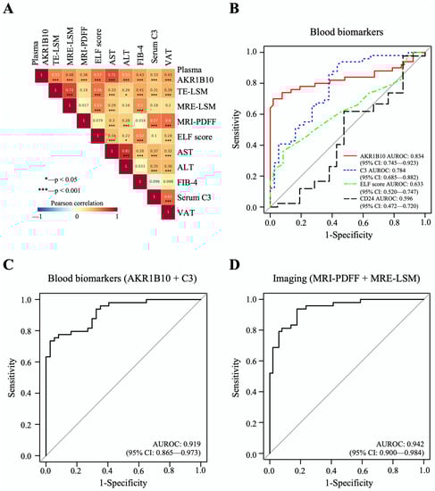 Correlations between major parameters and AUROC curves of biomarkers for the detection of NASH. (A) The results of Pearson’s correlation analyses between major parameters. (B–D), The predictive performance of AKR1B10 and other biomarkers for NASH vs. normal/NAFL.