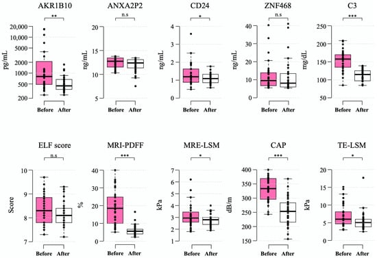 After a median of 6.5 (interquartile range 6.2–6.8) months after bariatric surgery, the mean levels of plasma AKR1B10 decreased to 529.0 ± 350.5 pg/mL (mean decrease, 2714.8 pg/mL). These changes were accompanied by a marked decrease in BMI (mean decrease, 9.4 kg/m2), body weight (mean decrease, 24.8 kg), and MRI-PDFF (mean decrease 13.1% point) as well as a significant improvement in other parameters. However, the ELF score did not decrease significantly after bariatric surgery (Table 3 and Figure 4).
