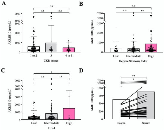 Validation of plasma AKR1B10 as a NAFLD progression marker in an independent cohort with a broad range of eGFRs. (A) Plasma AKR1B10 levels according to CKD status (n = 195). (B) and (C) Plasma AKR1B10 levels according to the likelihood of hepatic steatosis and advanced fibrosis based on HSI and FIB-4 score systems (n = 195). (D) Comparison of paired plasma and serum measurements of AKR1B10 in selected patients across a range of eGFRs. *—p < 0.05; **—p < 0.01; and n.s.—not significant.