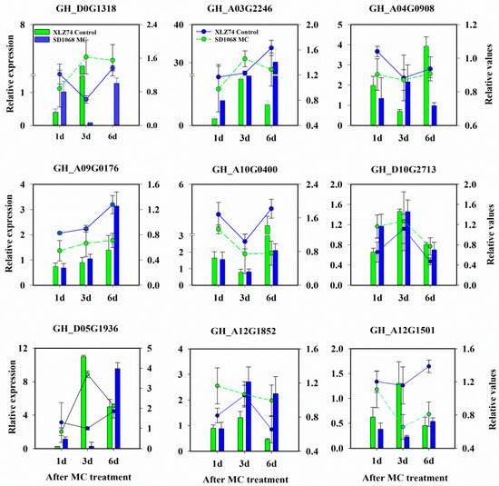 qRT-PCR validation of the RNA-seq results of 9 randomly selected genes. Y-axis represents the relative expression level based on qRT-PCR (displayed as columns) and relative values (the ratio of FPKM between MC and Water treatment, displayed as lines) of the gene shown on top of the graph. Error bars represent the SD of three biological replicates.