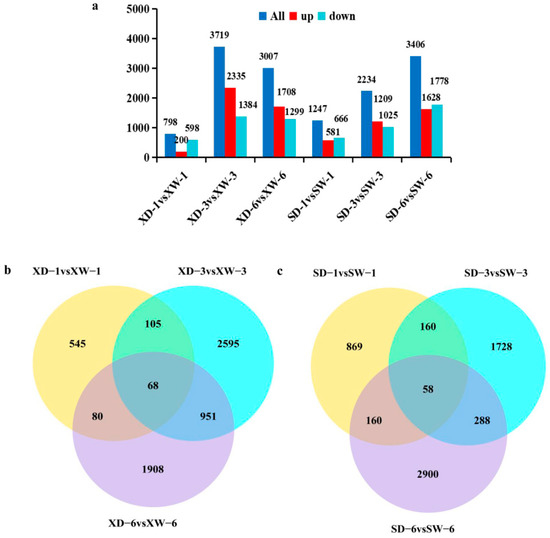 MC-induced DEGs in both cultivars at the three time points. (a) The number of DEGs up- or downregulated at 1, 3 and 6 d after MC treatment. X axis represents different comparisons and Y axis represents the number of DEGs identified. (b,c) Venn diagrams showing the number of DEGs unique to each time point or overlapping between different time points in XLZ74 (b) and SD1068 (c). XD and XW, XLZ74 treated with MC and water, respectively. SD and SW, SD1068 treated with MC and water, respectively.