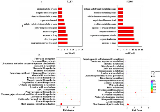 Gene Ontology enrichment analysis was applied to all the DEGs to identify active biological processes involved in cotton’s response to MC treatment. The top ten GO terms enriched in SD1068 were significantly different from those in XLZ74 (Figure 4a). For SD1068, most DEGs were associated with hormones, including ‘response to hormones’, ‘cytokinin metabolic process’, ‘regulation of hormone levels’, ‘cellular hormone metabolic process’ and ‘hormone metabolic process’. By contrast, hormone-related DEGs were not on the list of the top ten GO terms in XLZ74. The notable GO terms in XLZ74 were associated with “sulfate transport” and “sulfate compound transport”. GO enrichment analysis suggested that the molecular mechanism underlying the varietal difference in response to MC may be different.