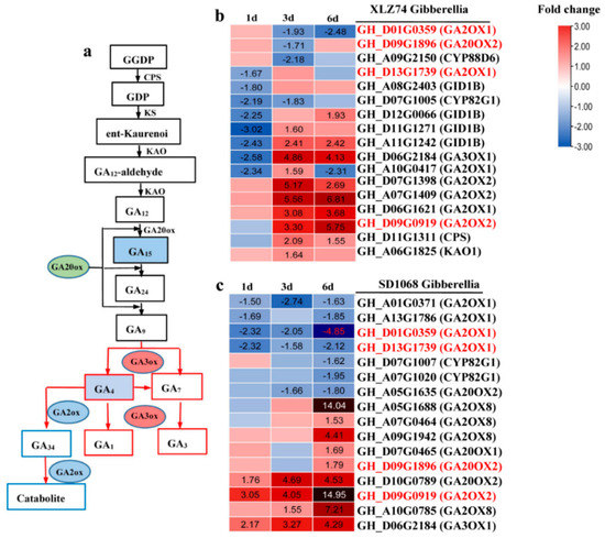 The expression patterns of GA-related genes in XLZ74 and SD1068. The results were based on the RNA-seq data. (a) A simple diagram to show the relationship of the genes and GA. (b,c) The heatmaps were generated based on the RNA-seq data. The number in box indicates the expression fold change of the gene (only those with a ≥1.5-fold difference are shown). MC-induced downregulated and upregulated expression are indicated by blue and red colors, respectively. Gene ID marked with red color represents common gene between XLZ74 and SD1068. All the numbers in heatmap were fold change.
