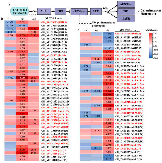 It was found that the expression of 43 and 36 DEGs related to auxin pathway (Figure 6a) significantly changed in XLZ74 and SD1068, respectively. Auxin regulates the expression of hundreds of genes [17]. Among these genes, Aux/IAA, GH3, and SAUR (SMALL AUXIN UP RNA) are three large primary auxin-induced genes. In XLZ74 (Figure 6b), 4 GH3 and 1 IAA29 were downregulated at 1 dps, whereas 36 genes, including 4 GH3, 13 IAA, 12 AUX and 7 SAUR, were obviously upregulated at 3 dps. In SD1068 (Figure 6c), 1 GH3.17, 1 IAA4, 3 AUX and 3 SAUR were downregulated at 1 dps or 3 dps, whereas 22 genes (3 IAA, 10 AUX and 9 SAUR) were obviously upregulated at 6 dps.