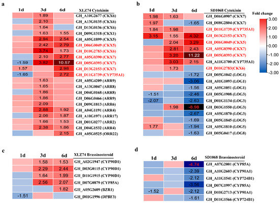 The expression patterns of CTK (a,b)- and BR (c,d)-related genes in XLZ74 and SD1068. The results were based on the RNA-seq data. The number in box indicates the expression fold change of the gene (only those with a ≥ 1.5-fold difference are shown). MC-induced downregulated and upregulated expression are indicated by blue and red colors, respectively. Gene ID marked with red represents common gene between XLZ74 and SD1068. All the numbers in heatmap were fold change.