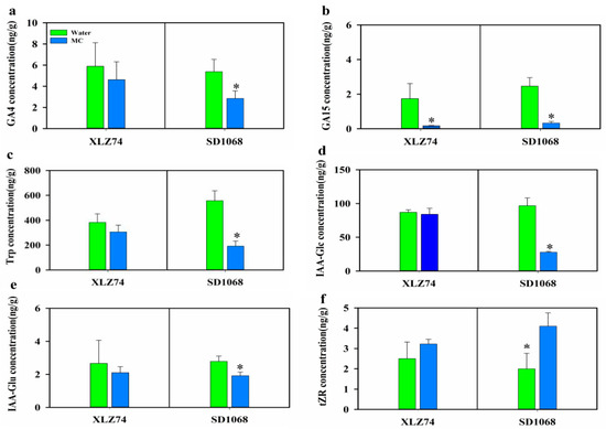 To investigate the effect of MC on the changes of endogenous hormones, GAs, IAAs and CTK contents in young stems of water and MC-treated plants at 6 dps were quantified. It was found that the content of some of GAs (GA4 and GA15) and IAAs (IAA-Glu and IAA-Glc) decreased, whilst CTK (tZR) increased in both varieties following MC treatment. Trp is a biosynthetic precursor of IAAs, and the content of Trp also decreased significantly. However, the content of other types of GAs, IAA and CTK did not change significantly. The content of GA4 was reduced by 21.6 and 47.1%, Trp by 20.12 and 65.62%, IAA-Glc by 2.4 and 71.2% and IAA-Glu by 21.0 and 30.1% in XLZ74 and SD1068, respectively (Figure 8a–e). The content of tZR was increased by 28.8 and 105% in XLZ74 and SD1068, respectively (Figure 8f). Compared to XLZ74, SD1068 showed a more significant decrease in GA4, Trp, IAA-Glc and Glu-Glu content, and a more significant increase in CTK content. However, a more significant decrease in GA15 content was found in XLZ74. The content of GA15 was reduced by 90 and 86.5% in XLZ74 and SD1068, respectively.