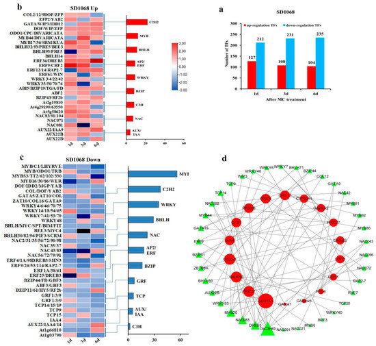 The number and expression patterns of the up- or downregulated transcription factors (TFs) in SD1068. (a) The total number of up- or downregulated TFs in SD1068 at three time points after MC treatment. (b) The expression pattern of upregulated TFs in SD1068. (c) The expression pattern of representative downregulated TFs in SD1068. (d) The co-expression network of hormone-related genes and TFs in SD1068. The larger triangles on TFs and circles on hormone-related genes indicated the stronger connectivity, which meant that the corresponding genes were more important for the interaction of TFs with hormone metabolism and signaling genes.