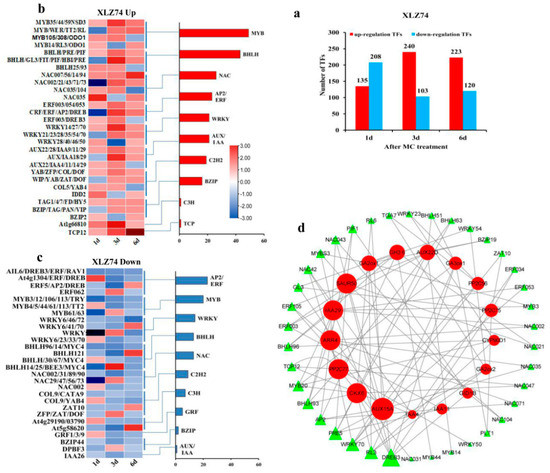 The number and expression pattern of the up- and downregulated transcription factors (TFs) in XLZ74. (a) The total number of up- or downregulated TFs in XLZ74 at three time points after MC treatment. (b) The expression pattern of representative upregulated TFs in XLZ74. (c) The expression pattern of representative downregulated TFs in XLZ74. (d) The co-expression network of hormone-related genes and TFs in XLZ74. The larger triangles on TFs and circles on hormone-related genes indicated the stronger connectivity, which meant that the corresponding genes were more important for the interaction of TFs with hormone metabolism and signaling genes.
