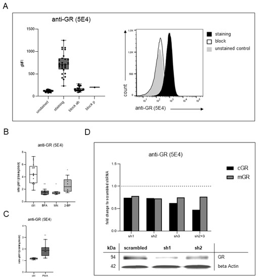 Figure 1. Anti-GR (5E4) antibody surface staining. (A) HEK293 cells were analyzed for mGR expression by flow cytometry using the anti-GR (5E4) antibody (n = 28). The staining was blocked successfully by 10-min incubation with 100-fold excess unconjugated primary antibody (block ab) or APTEK-26 peptide (block p) prior to the staining procedure. The gating strategy is displayed in Supplementary Figure S1A. Staining intensities are depicted as geometric mean fluorescence intensity (gMFI). (B) mGR expression on HEK293 cells after inhibition of Golgi transport and protein palmitoylation. Cells were incubated with 1 μg/mL BFA, 0.5 µg/mL MN, and 100 µg/mL 2-BP, respectively, for 24 h and mGR expression was measured by flow cytometry using the anti-GR (5E4) antibody (n = 6–8). The cells were gated according to Supplementary Figure S1A for analysis. r gMFI represents the ratio of geometric mean fluorescence intensity of staining to block with excess unconjugated antibody. (C) mGR expression on THP-1 cells after immunostimulation with 10 ng/mL PMA for 24 h. mGR expression was measured by flow cytometry using anti-GR (5E4) antibody (n = 8). The cells were gated according to Supplementary Figure S1A for analysis. r gMFI represents the ratio of geometric mean fluorescence intensity of staining to block with excess unconjugated antibody. (D) GR protein expression after stable GR knockdown detected by anti-GR (5E4) antibody. cGR levels were determined by western blot following SDS-PAGE. Protein levels were normalized to beta-actin and are displayed as fold-change to scrambled shRNA control samples. mGR levels were measured by flow cytometry. The data represent the ratio of geometric mean fluorescence intensity of staining to block with excess unconjugated antibody and are depicted as fold-change to scrambled shRNA control samples. Data modified from Strehl 2011 [12]. All boxplots show median, interquartile range, and minimum and maximum values, respectively. * p < 0.05, ** p < 0.01, compared to untreated control; Wilcoxon matched-pairs signed-rank test. Legend: 2-BP, 2-bromohexadecanoic acid; BFA, brefeldin A; cGR, cytosolic glucocorticoid receptor; mGR, membrane-bound glucocorticoid receptor; MN, monensin; PMA, phorbol 12-myristate 13-acetate.