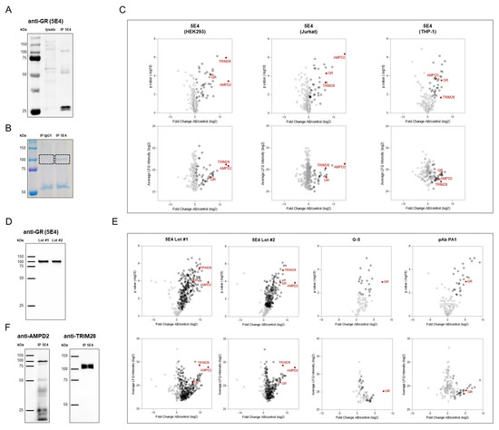 Figure 2. Verification of anti-GR (5E4) antibody specificity. (A) Western blot analysis of GR pulled down from HEK293 membrane fractions by immunoprecipitation using the anti-GR (5E4) antibody (IP 5E4). An amount of 20 µL of membrane fraction protein (lysate) were analyzed in parallel. Protein detection was achieved by adding the anti-GR (5E4) antibody followed by an HRP-conjugated anti-mouse IgG antibody as a secondary reagent. (B) Immunoprecipitation from HEK293 membrane fractions was performed using the anti-GR (5E4) antibody (IP 5E4) and mouse IgG1 as a corresponding isotype control (IP IgG1). For mass spectrometric analysis the protein content was visualized by Pierce Coomassie Brilliant Blue G-250 Dye after SDS-PAGE, and the indicated area of interest was extracted for analysis. (C) Mass spectrometric analyses of pull-down samples obtained by immunoprecipitation from HEK293, Jurkat, and THP-1 whole cell lysates using the anti-GR (5E4) antibody (AB) and mouse IgG1 as corresponding isotype control (Control). Differential protein abundance compared to isotype control was determined using a two-sample Student’s t test and black circles represent significance with an FDR cut-off of 5%. (D) Western blot analysis of GR pulled down from HEK293 whole cell lysates by immunoprecipitation using anti-GR (5E4) antibody Lot #1 (provided by Timea Berki [6]) and Lot #2 (Bio-Rad, Cat# MCA2469, RRID:AB_10844347). The protein content was visualized by incubation with anti-GR (5E4) antibody followed by HRP-conjugated anti-mouse IgG antibody as a secondary reagent. (E) Mass spectrometric analyses of pull-down samples obtained by immunoprecipitation from HEK293 whole cell lysates using anti-GR antibodies (AB), 5E4 (Lot #1 and #2), G-5, and pAb PA1, respectively, as well as corresponding isotype controls (Control). Differential protein abundance compared to isotype control was determined using two-sample Student’s t test, and black circles represent significance with an FDR cut-off of 5%. (F) Western blot analysis of pull-down samples from HEK293 whole cell lysates obtained by immunoprecipitation using the anti-GR (5E4) antibody. The protein content was visualized by incubation with primary antibodies directed against AMPD2 (Cat# PA5-26127, biotinylated) and TRIM28 (Cat# PA5-27648), respectively, followed by HRP-conjugated streptavidin and anti-rabbit IgG antibody as secondary reagents.