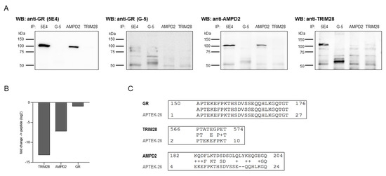 Figure 3. Re-evaluation of anti-GR (5E4) antibody specificity. (A) Comparison of target proteins by western blot analysis. Pull-down samples from HEK293 whole cell lysates were obtained by immunoprecipitation using the following antibodies: anti-GR (5E4), anti-GR (G-5), anti-AMPD2 (QQ13), and anti-TRIM28 (Cat# PA5-27648). The protein content was visualized by incubation with primary antibodies directed against GR (5E4, biotinylated), GR (G-5, biotinylated), AMPD2 (PA5-26127, biotinylated), and TRIM28 (Cat# PA5-27648) as indicated, followed by HRP-conjugated streptavidin and anti-rabbit IgG antibody as secondary reagents. (B) Mass spectrometric analysis of pull-down samples obtained by IP from HEK293 whole cell lysates using the anti-GR antibody, 5E4, with and without prior two-hour incubation with APTEK-26 peptide. Bar graphs show fold change of peptide incubation to without peptide incubation. (C) Amino acid sequences of the newly identified anti-GR (5E4) target proteins, AMPD2 (UniProt ID: Q01433) and TRIM28 (UniProt ID: Q13263), were blasted against the APTEK-26 peptide using NCBI Protein BLAST (https://blast.ncbi.nlm.nih.gov/Blast.cgi, accessed on 14 November 2020) [13].