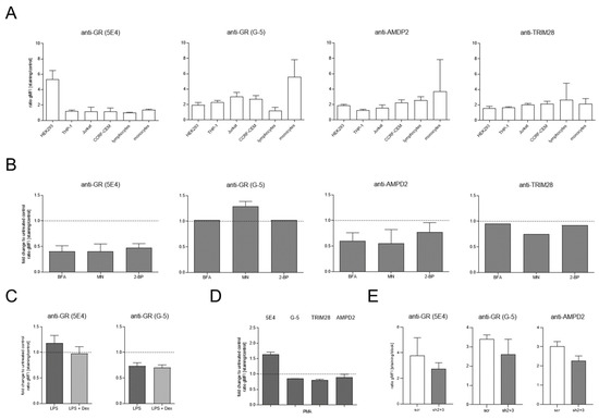 Figure 4. Independent validation of anti-GR (5E4) antibody specificity. (A) Multiple cell lines and primary human immune cells were cross-evaluated by flow cytometry. Surface stainings were performed using antibodies directed against GR, AMPD2, and TRIM28, as indicated (n = 3–32). The cells were gated according to Supplementary Figure S1A,B for analysis. r gMFI represents the ratio of geometric mean fluorescence intensity of staining to unstained control. (B) Surface expression of GR, AMPD2, and TRIM28 on HEK293 cells after inhibition of Golgi transport and protein palmitoylation. HEK293 cells were incubated with 1 μg/mL BFA, 0.5 µg/mL MN, and 100 µg/mL 2 BP, respectively, for 24 h, and surface expression was measured by flow cytometry (n = 1–9). The cells were gated according to Supplementary Figure S1A for analysis. r gMFI represents the ratio of geometric mean fluorescence intensity of staining to unstained control. Modification by inhibition of Golgi transport and protein palmitoylation is depicted in relation to untreated control samples. (C) Surface expression of the GR was evaluated by flow cytometry using antibody clones, 5E4 and G-5, after immunostimulation. CD14+ monocytes were isolated by magnetic cell separation and incubated with 1 μg/mL LPS ± 10-5 M Dex for 24 h, and surface expression was measured by flow cytometry (n = 2). The cells were gated according to Supplementary Figure S1C for analysis. The data are depicted in relation to untreated control samples. (D) Surface expressions of GR, AMPD2, and TRIM28 were evaluated by flow cytometry after immunostimulation. THP–1 cells were incubated with 10 ng/mL PMA for 24 h, and surface expression was measured by flow cytometry (n = 2–8). The cells were gated according to Supplementary Figure S1A for analysis. Modification by immunostimulation is depicted in relation to untreated control samples. (E) Surface expression of GR and AMPD2 after GR knockdown was evaluated by flow cytometry (n = 2–3). HEK293 cells stably expressed the indicated shRNA constructs. The cells were gated according to Supplementary Figure S1A for analysis. r gMFI represents the ratio of geometric mean fluorescence intensity of staining to unstained control. Bar graphs depict median and interquartile range. Legend: 2-BP, 2-bromohexadecanoic acid; BFA, brefeldin A; Dex, dexamethasone; LPS, lipopolysaccharide; MN, monensin; scr, scrambled.