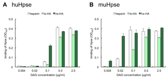 Different amounts of biotinylated GAGs were immobilized on a streptavidin-coated plate. Thereafter, the binding of hu- and mu-Hpse to the immobilized GAGs was examined using an enzyme-linked immunosorbent assay (ELISA). When the amounts of immobilized GAGs were serially diluted, hu- and mu-Hpse bound to hs-HA at lower immobilized amounts (Figure 2).