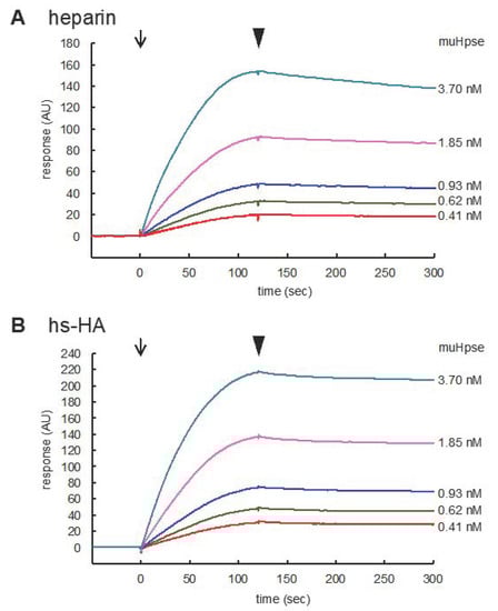 Sensorgrams for the binding of muHpse(mature) to immobilized sulfated GAGs. Recombinant muHpse(mature) (0.41–3.70 nM) was injected onto the surface of the sensor chips immobilized with biotinylated heparin (A) and hs-HA (B). The flow rate was 30 µL/min. The beginning of association and dissociation are indicated by arrows and arrowheads, respectively, in the figures. The sensorgrams were overlaid using BIAevaluation software.