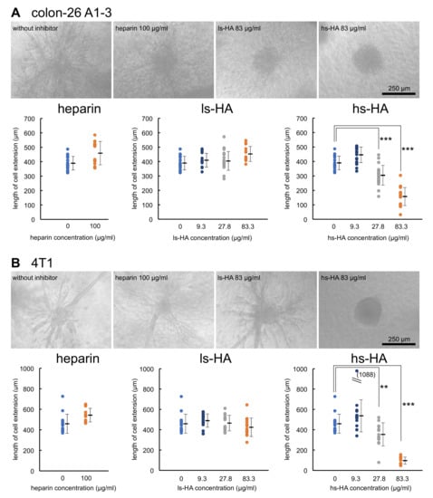 Our study showed that hs-HA effectively inhibited Hpse-mediated invasion of colon-26 and 4T1 cells inside the extracellular matrix of a collagen gel. We evaluated the invasiveness as the length of cell extension from the cancer cell cluster. This phenotypic change is caused by the alteration of several intracellular events, which are not fully characterized. A relevant cellular event is invasiveness as shown elsewhere [44]. It is expected that HS in the basement membrane surrounding the cell cluster is degraded during the invasion process. HS on the cell surface is also possibly involved in the invasion [4]. It is required to clarify what HS substrates are actually degraded during the invasion process in future studies. Regarding mesenchymal transition, we observed different features for an epithelial-to-mesenchymal transition during the cell extension experiment, that is, the upregulation of E-cadherin or downmodulation of N-cadherin was not observed. A matrix metalloproteinase MMP-2 was typically upregulated (data not shown). Expression of adhesion molecules has not been examined at present. Different assembly of collagen fibers in the presence of anionic molecules such as sulfated HA has been reported [48,49,50]. However, this is not likely the case. In the present study, hs-HA at a low concentration (27.8 µg/mL) was effective in the collagen gel with an estimated concentration of 3 mg/mL. A mixture of hs-HA and type I collagen at a ratio of 1:100 did not influence the fibrillogenesis of collagen I [48].