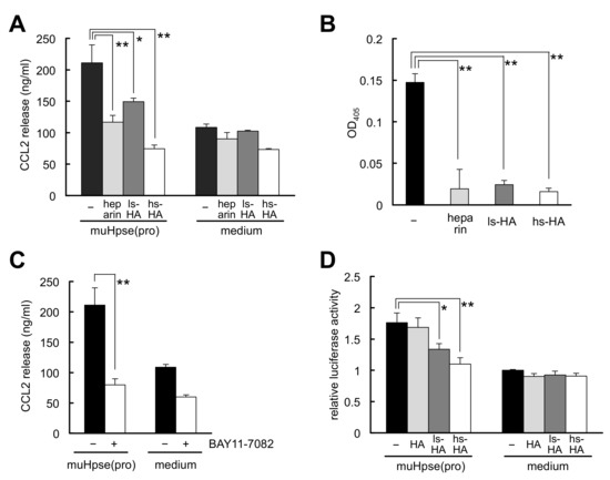 The inhibitory effects of heparin and sulfated HA on a proinflammatory effect of Hpse, that is, muHpse(pro)-mediated release of the chemokine CCL2 from colon-26 cells [14], were examined. The release of CCL2 was significantly lower in the presence of heparin or sulfated HA (Figure 5A). The binding of muHpse(pro) to the cell layer was mostly blocked in the presence of heparin or sulfated HA (Figure 5B). The muHpse(pro)-mediated release of CCL2 was inhibited by pretreatment with BAY11-7082, an inhibitor of κB kinase (Figure 5C). Treatment of the cells with sulfated HA but not unmodified HA reduced muHpse(pro)-mediated NF-κB-dependent luciferase expression (Figure 5D).