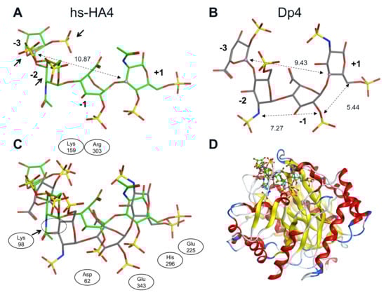 Conformation of sulfated GAG tetrasaccharides bound to a human Hpse molecule as a result of molecular modeling. (A) Conformation of hs-HA4 and (B) Dp4. Dotted lines indicate the distance between two sugar residues. The distance from (+1) to (−3) sugar was 10.87 Å in hs-HA4, whereas it was 9.43 Å in Dp4. Relatively adjacent sulfated groups in (−2) and (−3) sugar residues of hs-HA4 are indicated with arrows in panel A. (C) Superimposed conformations of hs-HA4 and Dp4. Adjacent amino acid residues are also indicated. (D) Predicted 3D complex of the tetrasaccharides with huHpse. Green and gray backbones indicate hs-HA4 and Dp4, respectively.