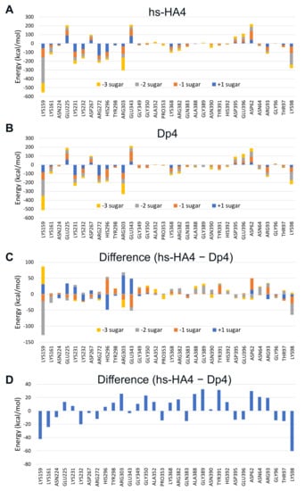 Structure files and a set of input/output files used for FMO calculations are available at the FMODB (https://drugdesign.riken.jp/FMODB/, accessed on 21 April 2022); FMODBID: 9G4Y2 (hs-HA4) and LJZL9 (Dp4). Simple data analysis can be performed using the FMODB web interface, and detailed analysis can be performed using the BioStation Viewer software (https://fmodd.jp/biostationviewer-dl/, accessed on 21 April 2022).