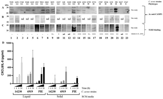 Expression of Christie–Atkins–Munch–Petersen (CAMP)1 in Cutibacterium acnes (C. acnes) strains. C. acnes surface proteins were extracted from a five-day culture (A,C) in liquid RCM medium or (B) on solid RCM medium and separated by electrophoresis in a 4–12% NuPAGE SDS BisTris gel (50 μg). Separated proteins were transferred onto nitrocellulose membranes, which were incubated (A,B) with antibodies against CAMP1 or (C) with recombinant toll like receptor (TLR)-2. TLR-2 binding activity was detected with specific biotinylated antibodies against TLR-2, as described in the Materials and Methods. TLR-2 binding activity previously reported by Lheure et al. [24]. Lanes 1 to 12 correspond to phylotype IA1 strains: 75150, 16351, 17248, 53468, 41103, 6919, 78910, 36862, RON, 22197, LIE and 31430, respectively. Lane 13 corresponds to phylotype IA2 strain: CHR. Lanes 14 to 22 correspond to phylotype IB strains: 14230, 12513, 22795, 47474, 27387, 25236, GUE, PIE and 54137, respectively. Lane 23 corresponds to phylotype II strain: 27647. (D) HaCaT cells were stimulated for 1, 4, 6 and 24 h at 37 °C, with C. acnes strains 6919 (phylotype IA1), 14230 (phylotype IB) or PIE (phylotype IB) grown in liquid or on solid medium. C-X-C motif chemokine ligand interleukin (CXCL)8/(IL)-8 protein levels were assessed by enzyme-like immunosorbent assay (ELISA). nd: non-determined.