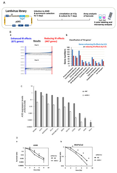 To identify new target genes for which the loss of expression enhances radiosensitivity, genome-wide negative screening with a lentiviral shRNA library containing approximately 10,000 genes was performed. For this purpose, we used lung cancer cells, because radiation therapy is frequently used for various types of lung cancers from early to progressed stages. Human lung adenocarcinoma A549 cells were transfected with a lentiviral shRNA library, then divided into two groups: one of which was γ-irradiated at 4 Gy, the other was mock-irradiated, and both were then cultured for 7 days. To quantify differences in the abundances of each shRNA clone between non-irradiated and irradiated cells, genomic DNA were extracted from each cell group and specific barcode sequences incorporated into genomic DNA were amplified by PCR and analyzed using microarray. The declined detection in γ-irradiated cells containing a specific shRNA indicates that the knockdown of the corresponding target gene caused radiosensitivity (Figure 1A).