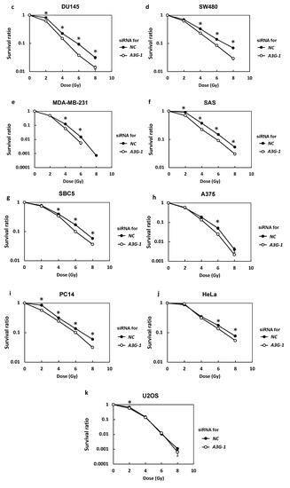 To assess whether the knockdown of the A3G gene induces radiosensitization, the survival rates of A3G-knockdown and control cells exposed to γ-irradiation were compared in 11 solid cancer-derived cell lines. As shown in Figure 1C, A3G expression levels were diverse between cell lines. Whereas A3G levels were reported to correlate with radiosensitivity in lymphoma cells [23], there was no correlation between A3G expression levels and radiosensitivity among cells tested in our experiment (data not shown).
