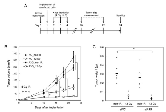 A xenograft model was utilized to investigate whether A3G dysfunction suppresses the growth of X-ray-irradiated A549 tumors. A549 cells transfected with either the control or siA3G-1 were subcutaneously implanted in nude mice and then X-ray irradiated on days 1 to 3 after implantation (Figure 4). As shown in Figure 4B,C, the A3G knockdown itself slightly suppressed the tumor growth without the irradiation condition and further attenuated the tumor growth after three doses of 4 Gy X-ray irradiation, although a statistically significant difference was not observed between irradiated siNC control and irradiated A3G-knockdown groups. Tumor volumes in the irradiated A3G-knockdown group were uniformly small, while non-irradiated and irradiated control siNC and non-irradiated A3G-knockdown groups had variations in the tumor weight at 24 days after implantation. A statistical difference in tumor weight was only detected between non-irradiated siNC and irradiated A3G-knockdown groups (Figure 4C). This suggests that A3G knockdown suppressed tumor xenograft growth, possibly in a synergistic manner with X-ray irradiation.
