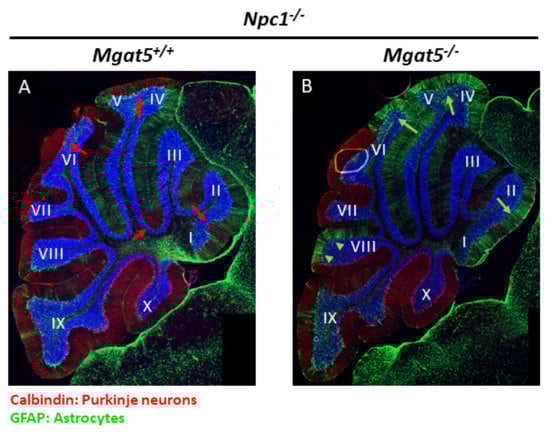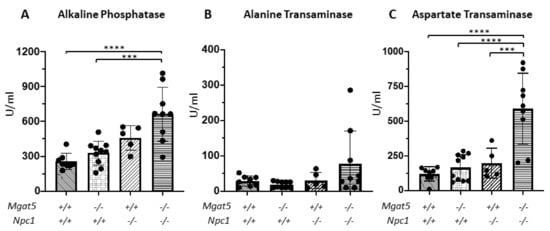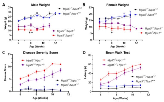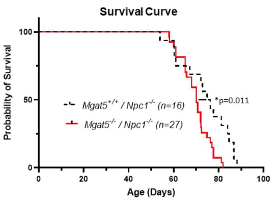 2.1. Characterization of Mgat5−/−:Npc1−/− Mice
