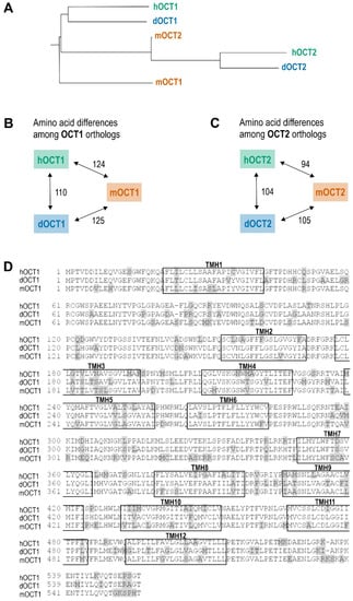 - Meyer, M.J.; Schreier, P.C.F.; Basaran, M.; Vlasova, S.; Seitz, T.; Brockmöller, J.; Zdrazil, B.; Tzvetkov, M.V. Amino acids in transmembrane helix 1 confer major functional differences between human and mouse orthologs of the polyspecific membrane transporter OCT1. J. Biol. Chem. 2022, 101974. [Google Scholar] [CrossRef]