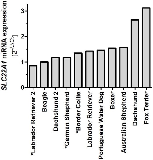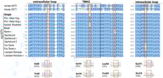 2.6. Variability of OCT1 Sequence and Expression among Different Dog Breeds