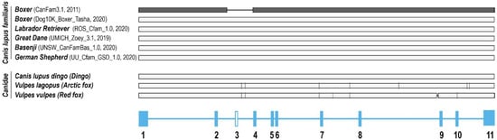 - Hoeppner, M.P.; Lundquist, A.; Pirun, M.; Meadows, J.R.S.; Zamani, N.; Johnson, J.; Sundström, G.; Cook, A.; Fitzgerald, M.G.; Swofford, R.; et al. An Improved Canine Genome and a Comprehensive Catalogue of Coding Genes and Non-Coding Transcripts. PLoS ONE 2014, 9, e91172. [Google Scholar] [CrossRef]