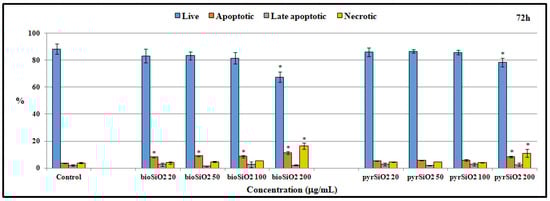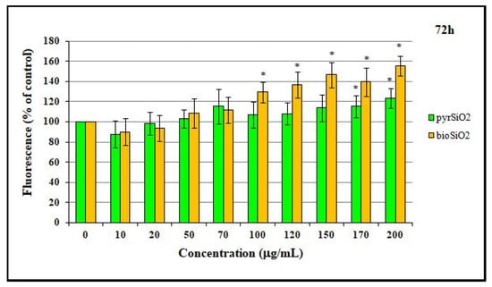 | pyrSiO2 200 µg/mL | 49.47 ± 1.14 | 29.58 ± 0.79 (*) | 20.95 ± 1.56 (*) |