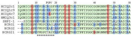 The alignment of sequences of peptides: HCIQ2c1 (UniProtKB ID: A0A6B7FBD3), HCIQ1c9 (A0A6B7FEJ3), HCIQ4c7 (A0A6B7FA07), HCRG1 (C0HJU6), HCRG2 (C0HJU7), and HCRG21 (P0DL86) from H. crispa; HMIQ3c1 (A0A3G2FQK2) from H. magnifica; and SHPI-1 (P31713) from Stichodactyla helianthus. P1-P1’—residues of the reactive sites of Kunitz-type peptides. The asterisks (*) below the sequences indicate the contact sites with proteases. Neutral, positively charged, and negatively charged residues are colored in green, blue, and red, respectively; non-similar residues are shown on white background.