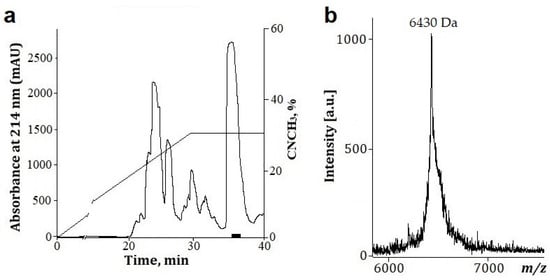 The peptides HCIQ2c1, HCIQ4c7, and HMIQ3c1 were obtained as a result of their production in Escherichia coli, as previously described [,]. This technique was successfully used to obtain HCIQ1c9. The fusion proteins expressed in E. coli and purified by metal affinity chromatography had an expected molecular mass of about 23 kDa and were cleaved by CNBr. Targeted peptides were purified via RP-HPLC. The retention time of HCIQ1c9 on a reverse-phase column was 35.5 min (Figure 2a), which was close to the retention times of the previously obtained peptides [,]. The final yield of HCIQ1c9 was 9.02 mg/L of cell culture. The molecular masses of the peptides corresponded to the expected ones, while the molecular mass of HCIQ1c9 was 6429 Da (Figure 2b). The N-terminal sequences (15 a.a.) determined by the automated Edman degradation matched well with sequences deduced from cDNA.